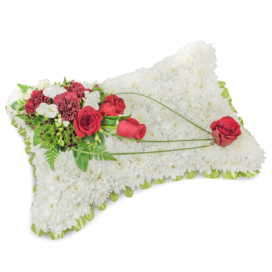 Offer your condolences with grace using our sophisticated sympathy flower arrangement. This elegant bouquet showcases a blend of white chrysanthemums, red roses, white freesias, dark red carnations, dianthus, and gentle bear grass, arranged to perfection.